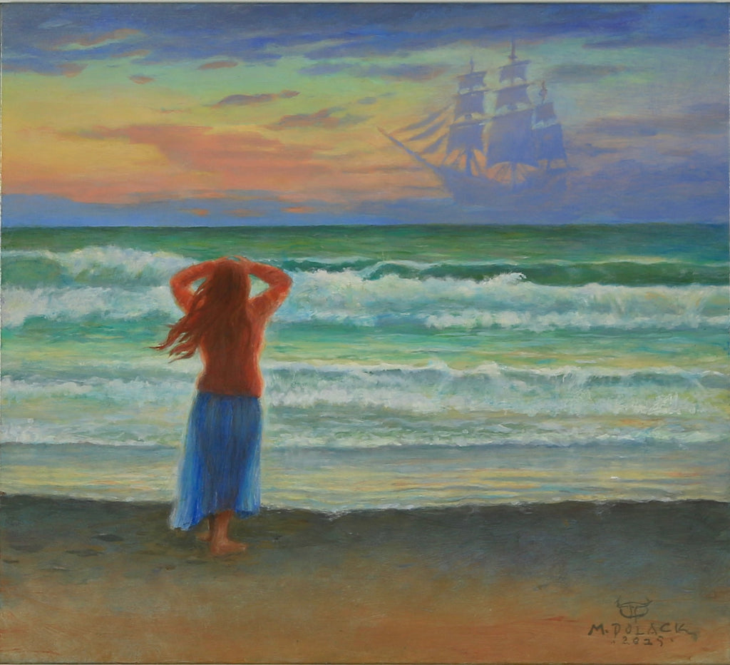 Ghost Ship is a 10 x 9 acrylic on panel painting created by Monte Dolack in 2025. According to Dolack "my wife and I were walking along Wrightsville Beach in North Carolina near the time of sunset. She brought my attention to a changing shape in the clouds on the horizon. For a fleeting instant we both observed an ethereal three masted ship in the cloud formation which disappeared moments later. This area of the Atlantic Ocean is known as the Graveyard of the Atlantic-rich with the bones of 500 years of lost ships-including some pirate ships. When I got back into the studio I made a little sketch of the ship from memory which later manifested as the Ghost Ship painting with my wife as witness to this magical moment."