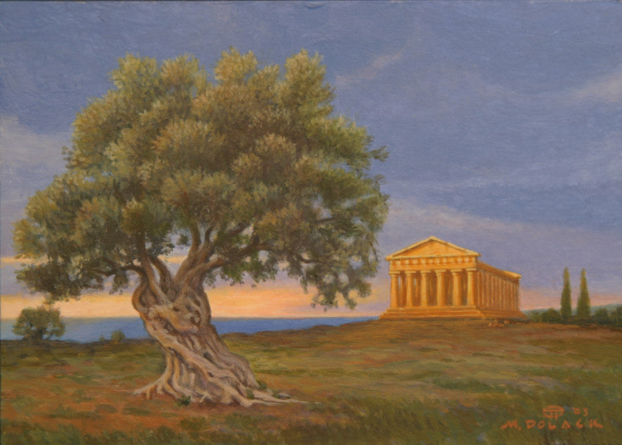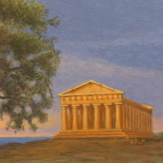 Acrylic on panel; represents a temple and a tree paired in eternity;