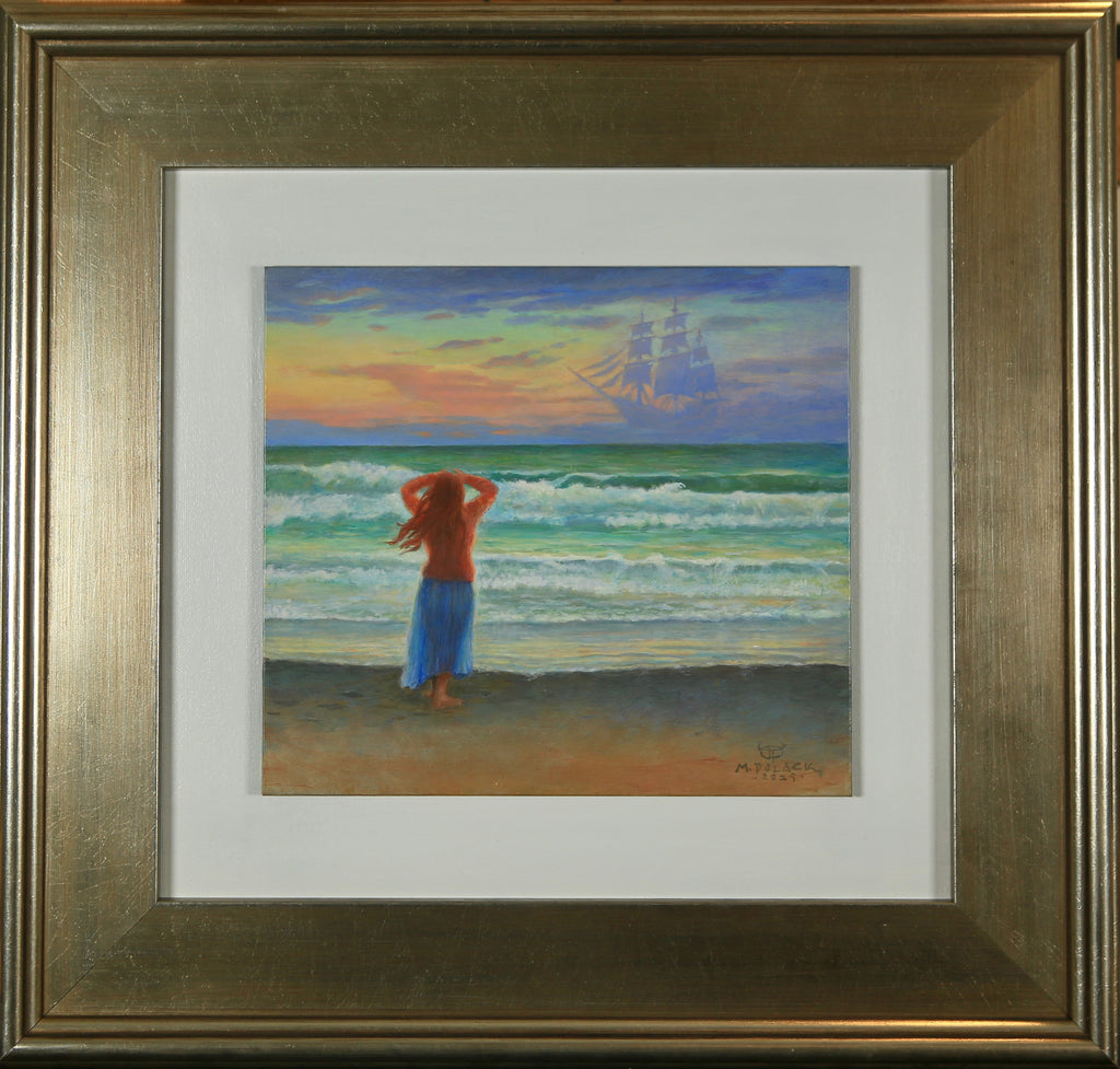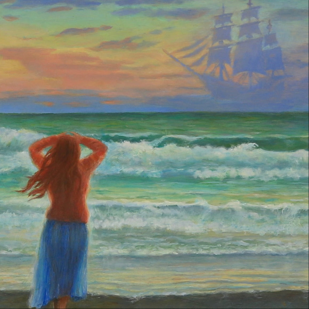 Ghost Ship is a 10 x 9 acrylic on panel painting created by Monte Dolack in 2025. According to Dolack "my wife and I were walking along Wrightsville Beach in North Carolina near the time of sunset. She brought my attention to a changing shape in the clouds on the horizon. For a fleeting instant we both observed an ethereal three masted ship in the cloud formation which disappeared moments later. This area of the Atlantic Ocean is known as the Graveyard of the Atlantic-rich with the bones of 500 years of lost ships-including some pirate ships. When I got back into the studio I made a little sketch of the ship from memory which later manifested as the Ghost Ship painting with my wife as witness to this magical moment."
